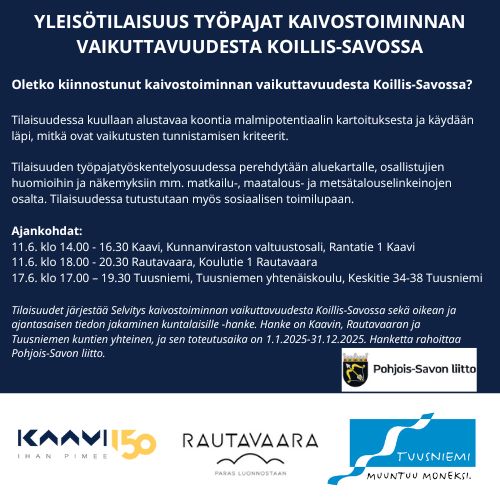 Työpajatilaisuudet kaivostoiminnan vaikuttavuudesta Koillis-Savossa järjestetään Kaavilla, Rautavaaralla ja Tuusniemellä.